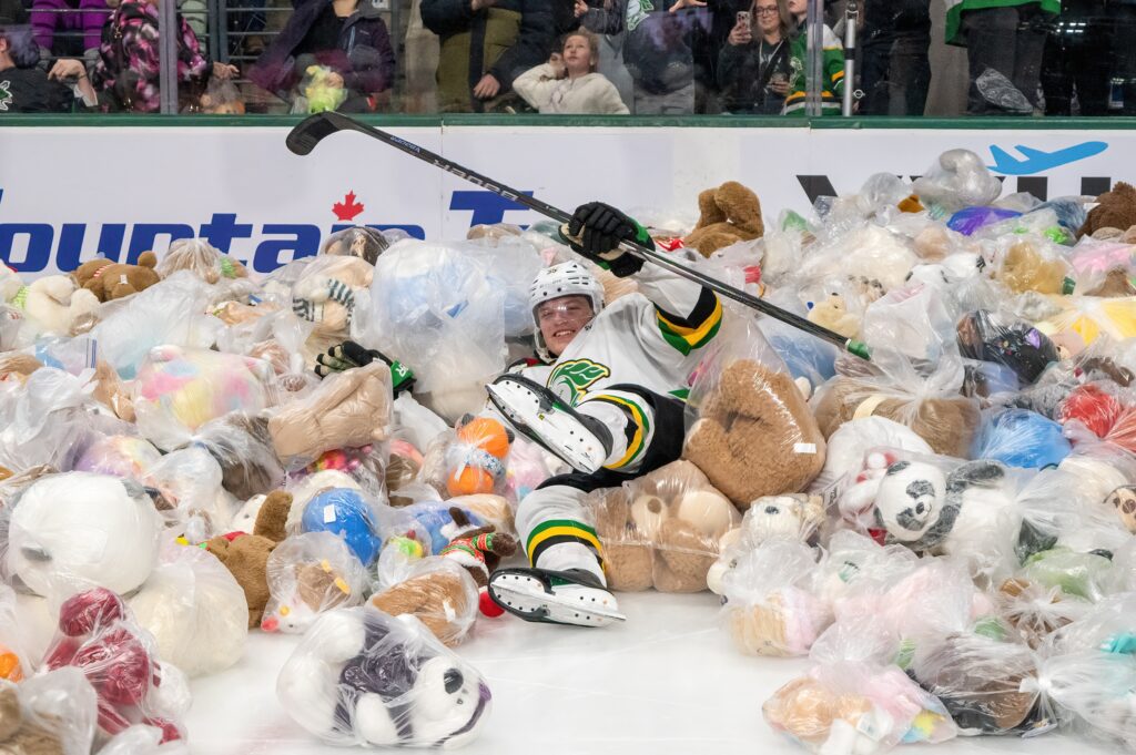 Linus Funck‘s second period goal brought on the onslaught of teddies, which are annually donated to the Salvation Army for their Christmas hamper program.